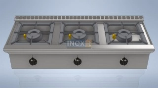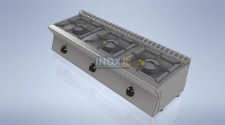 Професионален газов котлон с три високомощни газови горелки, разположени една до друга.