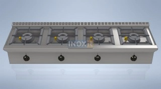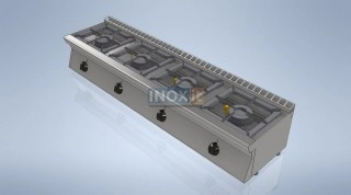Професионален газов котлон с четири високомощни газови горелки, разположени една до друга.
