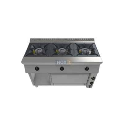 Професионална печка с три високомощни газови горелки, разположени една до друга с електрическа фурна и отворен шкаф.