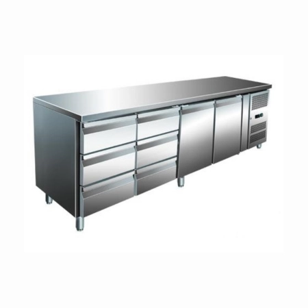 Професионална хладилна маса с 6 чекмеджета, две плътни врати и десен комресор.