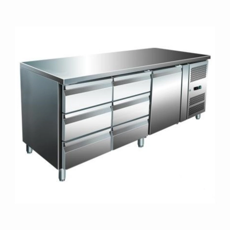 Професионална хладилна маса с 6 чекмеджета, една плътна врата и десен комресор.